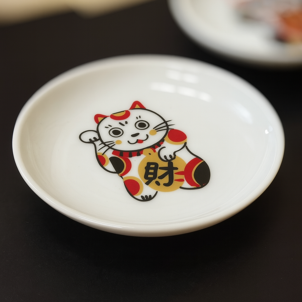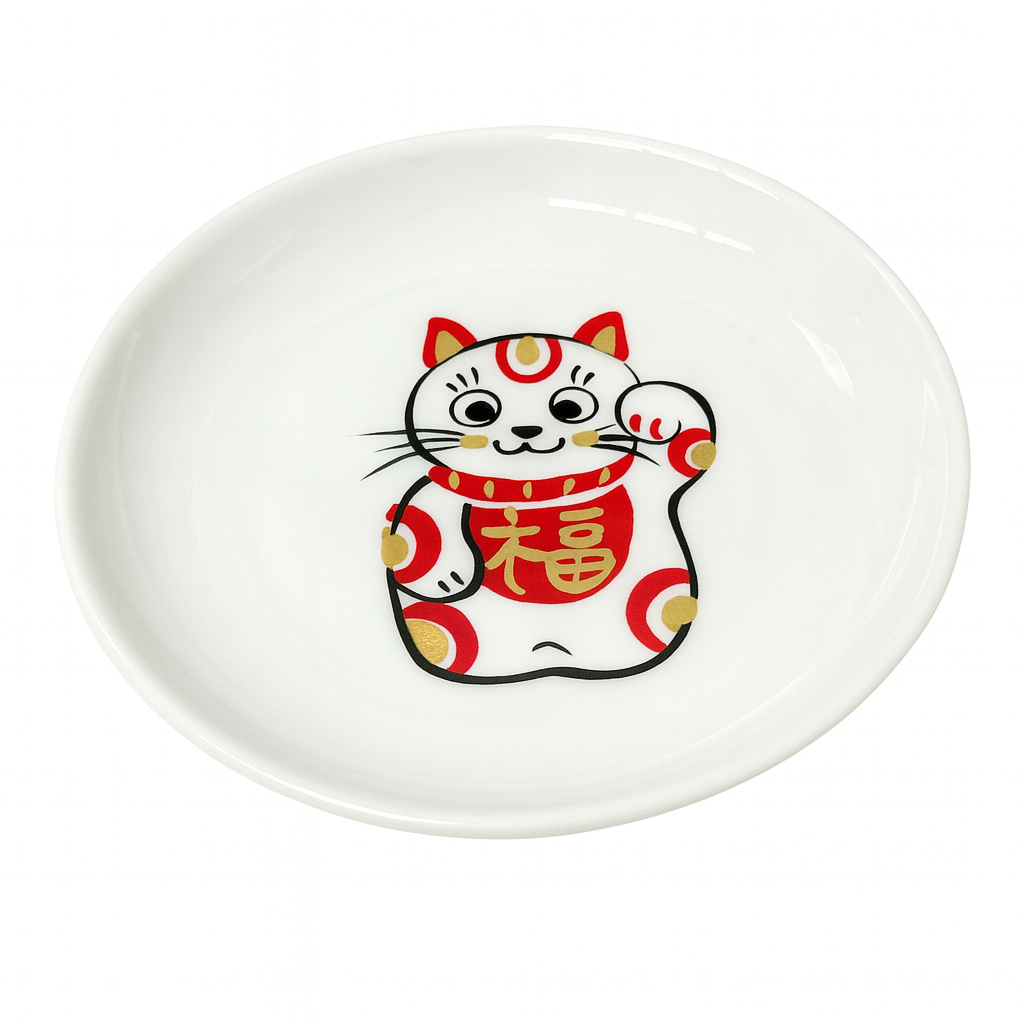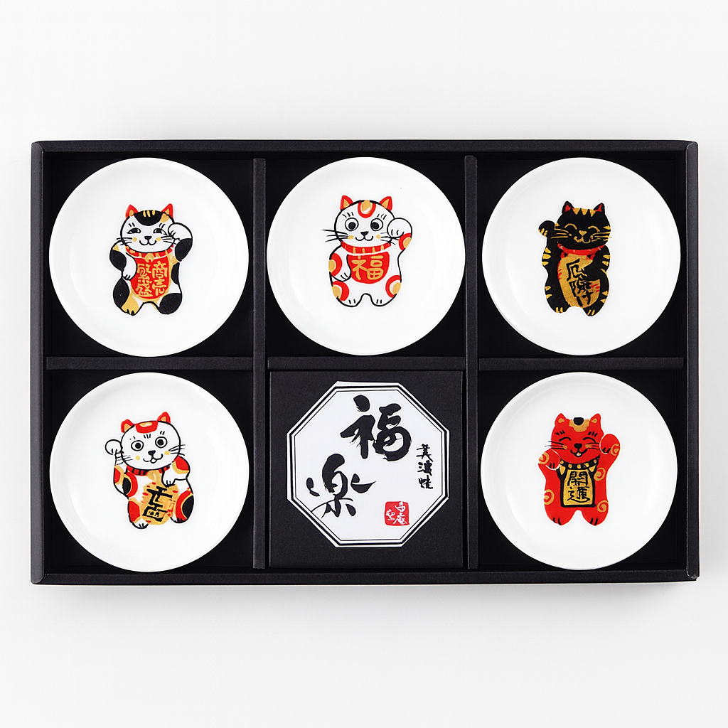 A warm and cheerful set of five small porcelain dishes featuring different Maneki-Neko (lucky cat) designs, each bringing its own wish for happiness, fortune, and prosperity. Every dish is crafted with care, showing fine detail in the hand-painted red, gold, and black patterns that make each cat come to life.