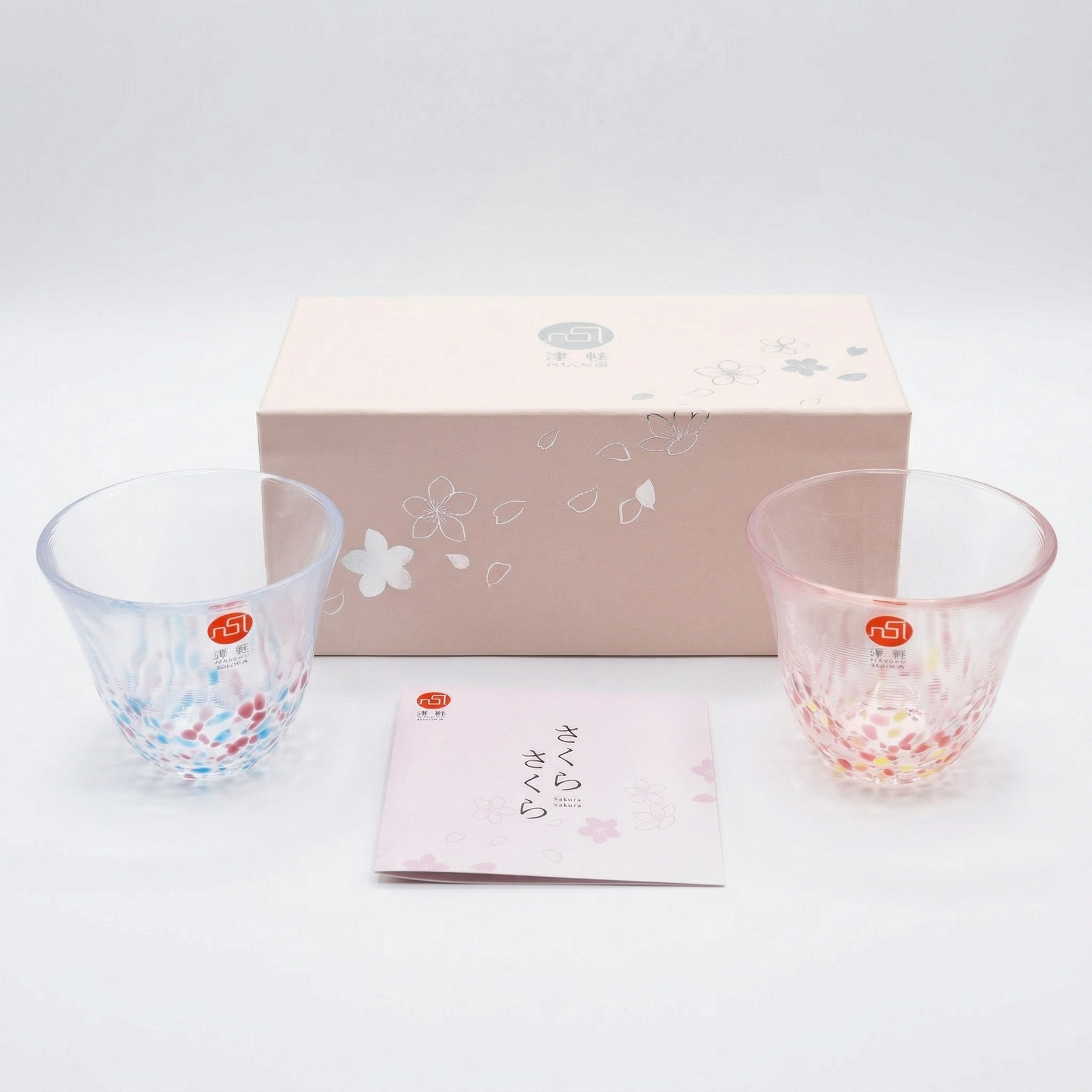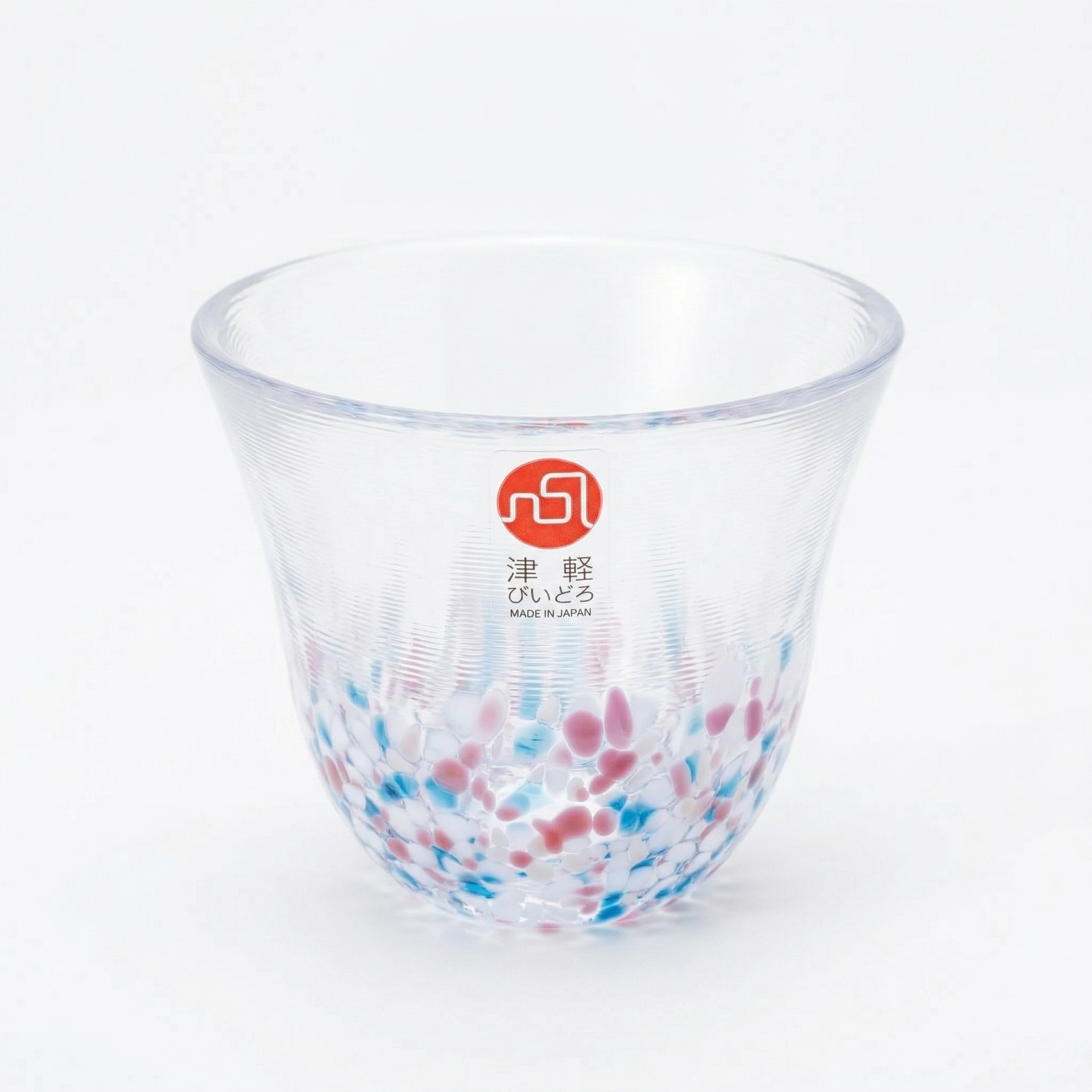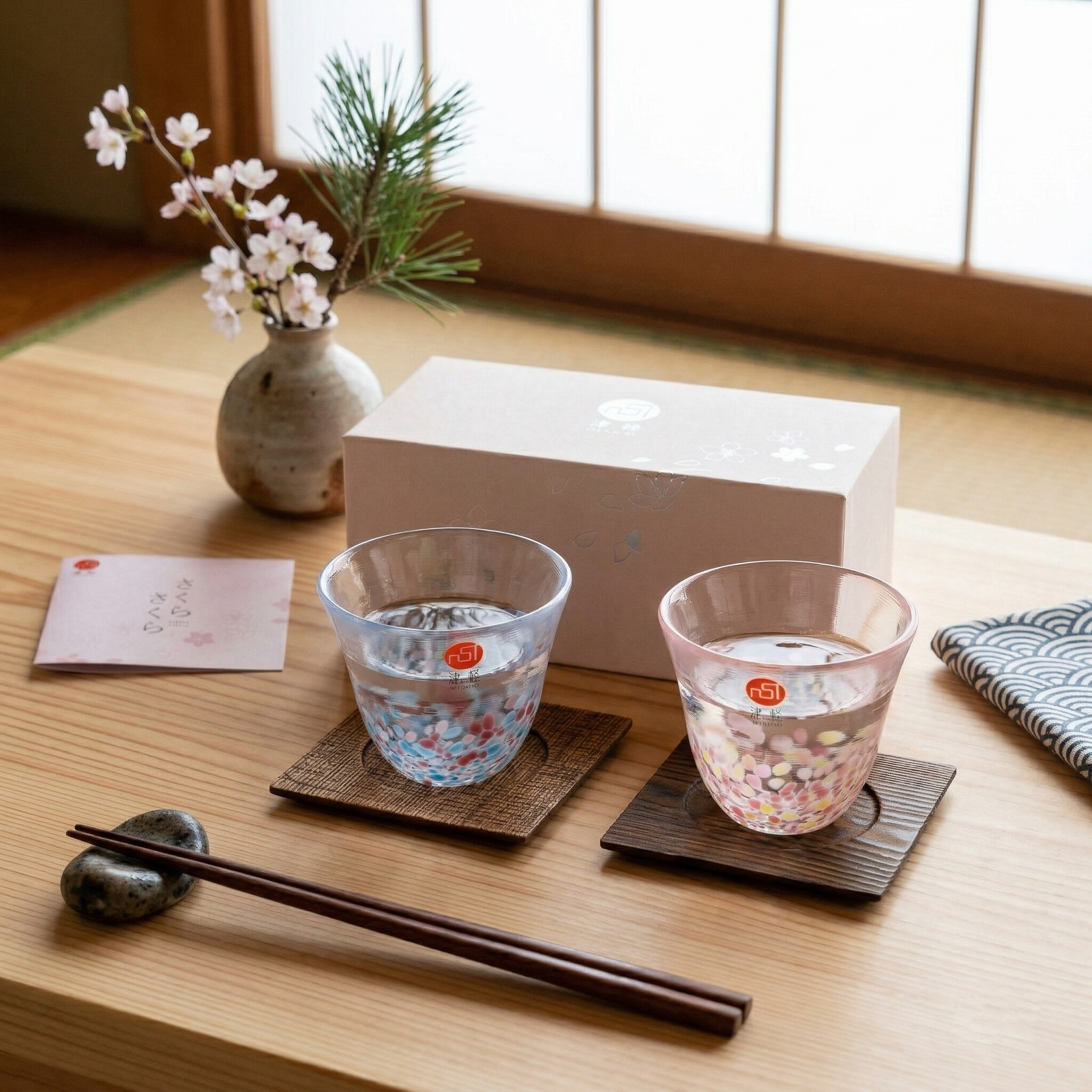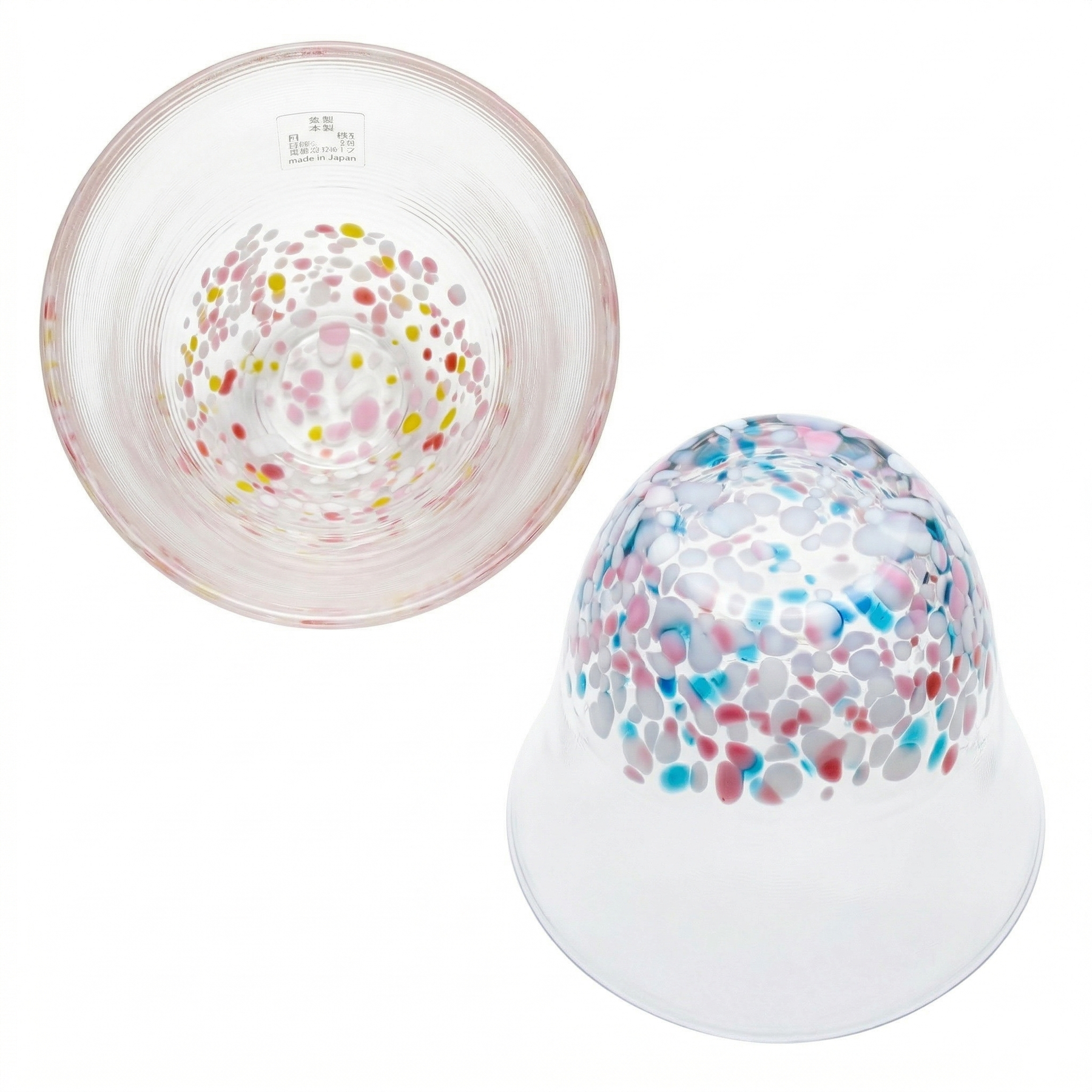 The Sakura Pair includes two small sake cups. One features a soft pink pattern inspired by cherry blossoms, while the other has a blue-toned "Sky" pattern. These are made using a confetti technique where tiny shards of colored glass are fused into the clear base. It gives each cup a unique, pebbled texture that catches the light differently depending on how you hold it.